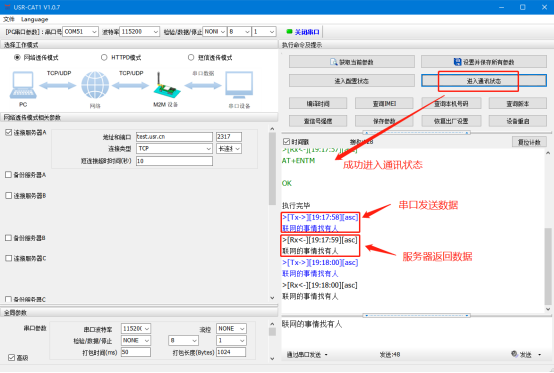 2、DTU出廠默認連接的是我司的測試服務器:test.usr.cn:2317;串口向服務器發送什么數據,服務器就將接收到的數據返回到串口。