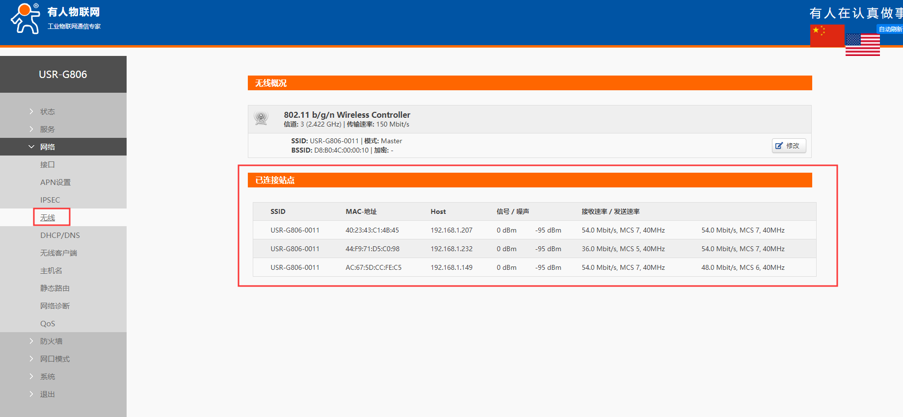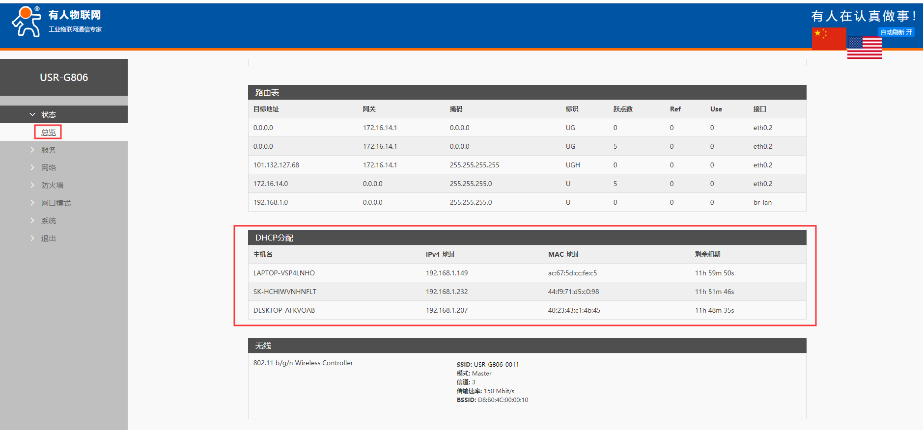 4.在內(nèi)置網(wǎng)頁(yè)中看一下接入設(shè)備動(dòng)態(tài)獲取到的IP和MAC,可以在狀態(tài)總覽界面看到DHCP分配部分,以及字啊網(wǎng)絡(luò)--無線--已連接站點(diǎn)中查看