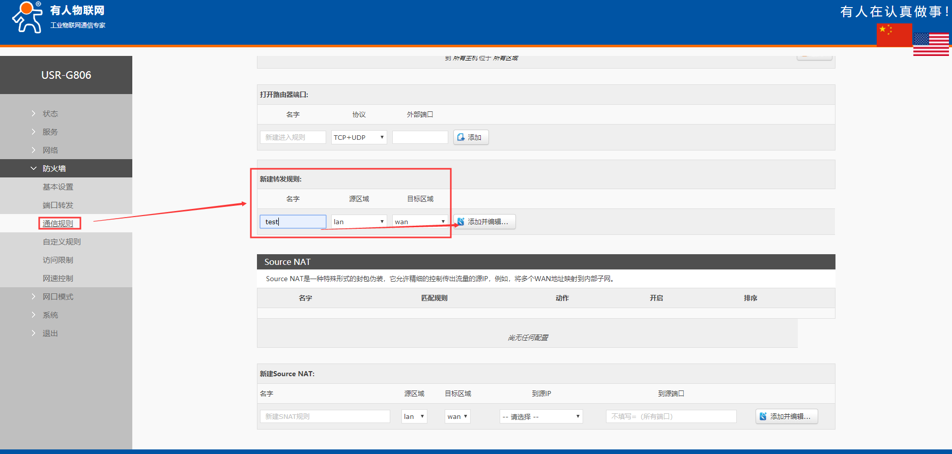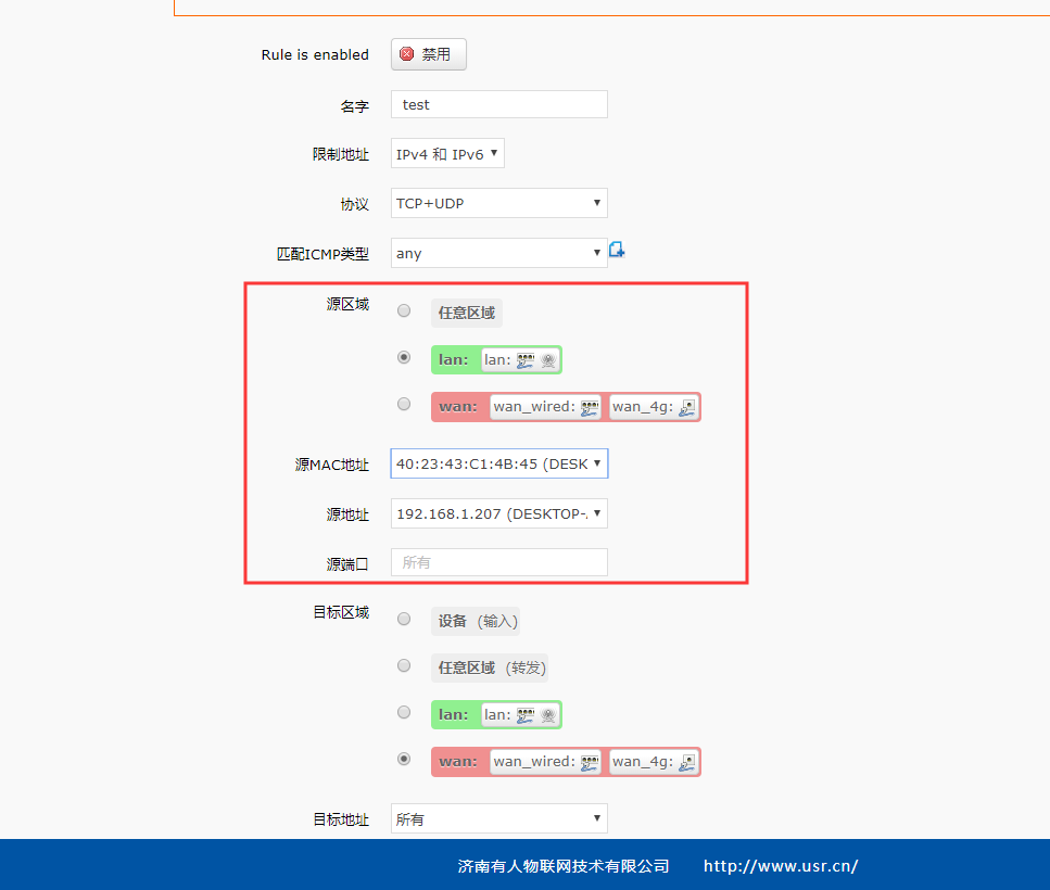6.在跳轉(zhuǎn)的頁(yè)面中,源區(qū)域選擇lan,源 MAC 地址和源地址選擇想要禁用設(shè)備的IP和MAC(如果是想禁用806LAN口下級(jí)的所有設(shè)備訪問外網(wǎng),可以選擇全部)。設(shè)置的設(shè)備IP和MAC要保持一致,也就是要是同一個(gè)設(shè)備