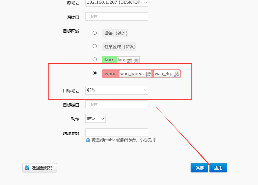 7.在目標(biāo)區(qū)域選擇 WAN,目標(biāo)地址填寫禁止訪問的 IP(如果想不訪問所有外網(wǎng)目標(biāo)地址選擇所有),動(dòng)作選擇“拒絕”設(shè)置完成后,點(diǎn)擊保存和應(yīng)用