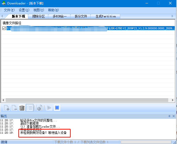 7、出現“未檢測到有效設備!等待插入設備”時,斷電重啟模塊(拔掉電源再插上),等待固件下載完成即可