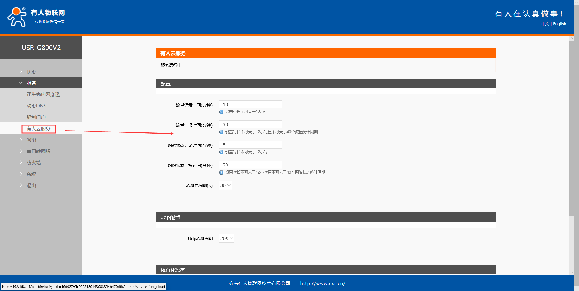 2、V1.0.24以上固件默認開啟有人云服務功能。界面可以配置統計流量、網絡狀態、心跳包的上報參數;同時支持數據上報到私有部署的有人云服務器地址