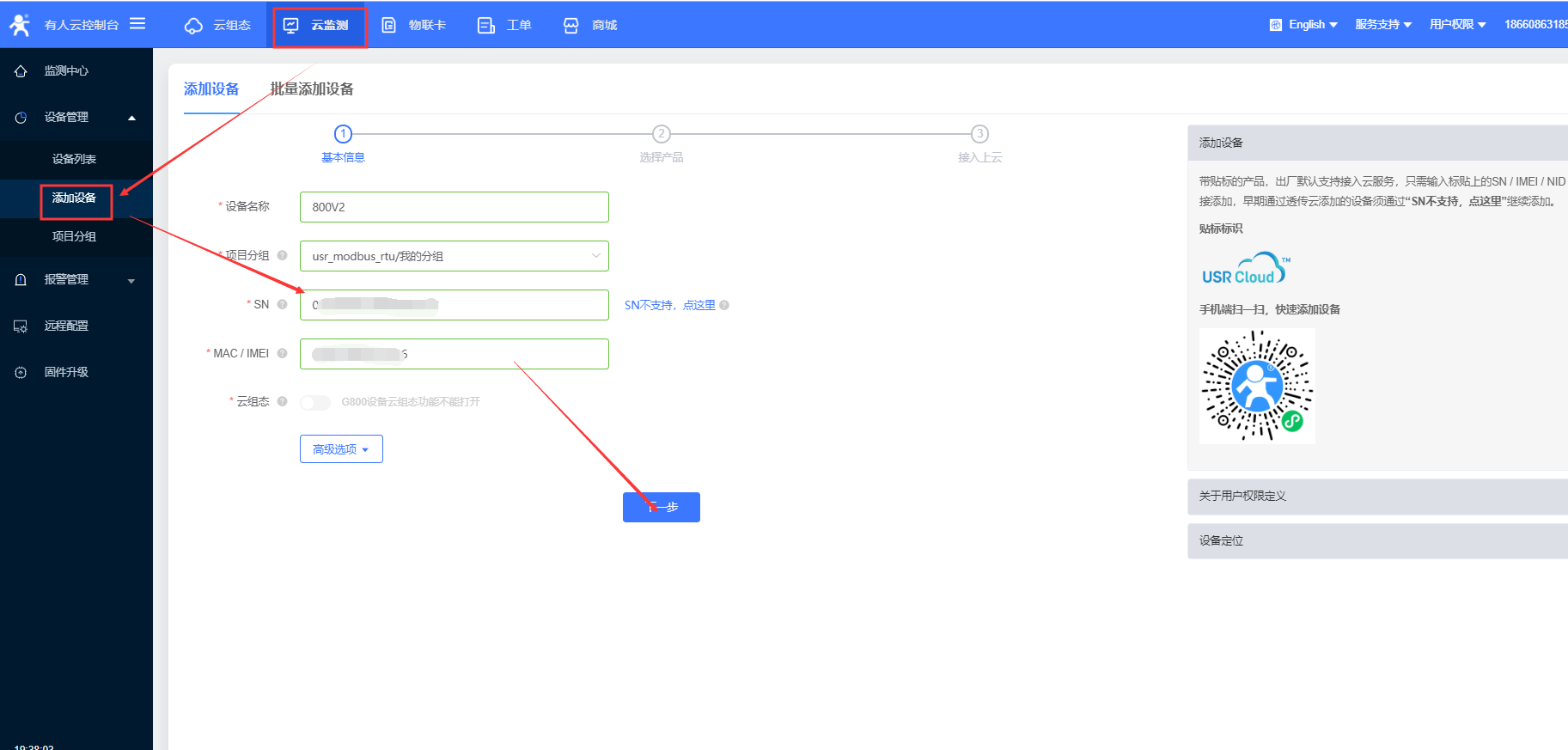 添加設備,點擊設備管理中的添加設備,之后將設備SN和IMEI添加。在有人云云監測中添加時需要設備的MAC、IMEI、SN這些參數,參數都設備便簽上可以查看,添加完成后點擊下一步,確認添加