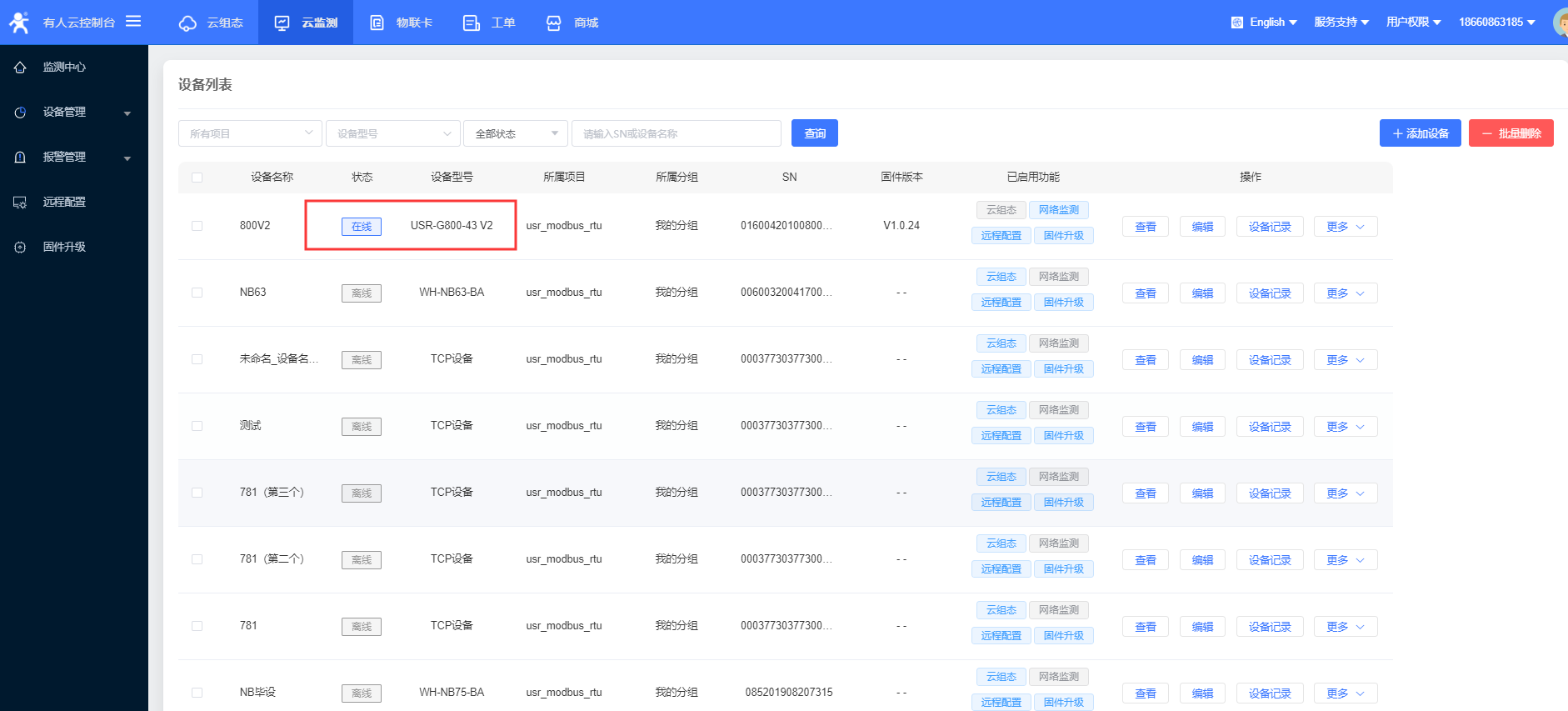 5、設備添加完成,重新上電或等待一會后云監測中設備上線,至此在有人云上添加設備完成