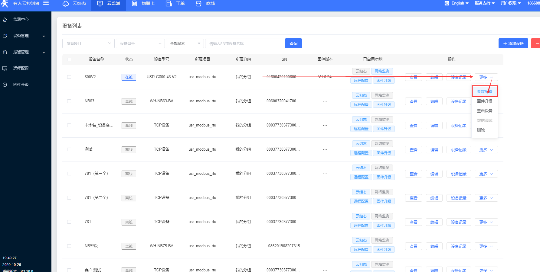 在“云監測”的“設備列表”下,找到想要進行參數配置的設備,點擊“更多”,選擇“參數配置”