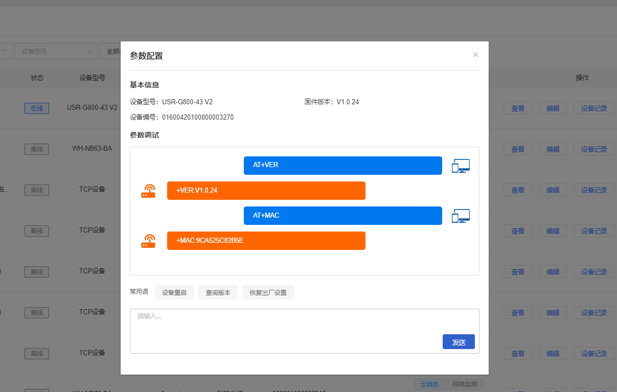 在參數配置界面,可以輸入指令來進行配置設備的某些參數,或者讀取設備的某些參數,并且參數的返回也會顯示在平臺上面