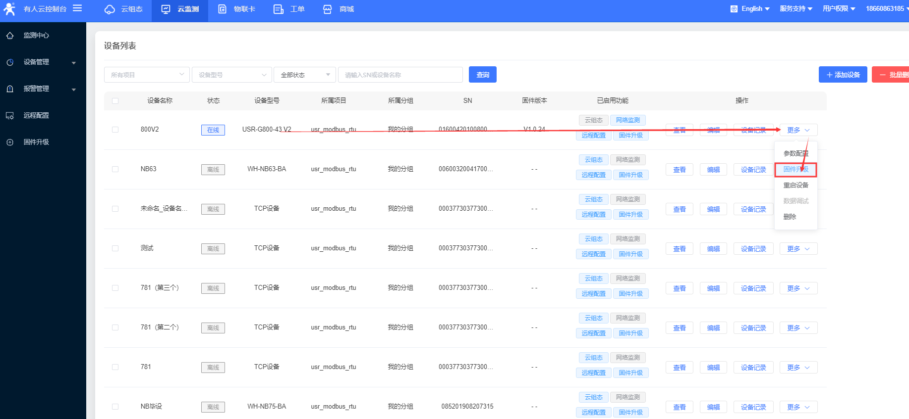 在“云監測”的“設備列表”下,找到想要進行固件升級的設備,點擊“更多”,選擇“固件升級