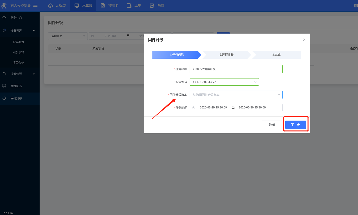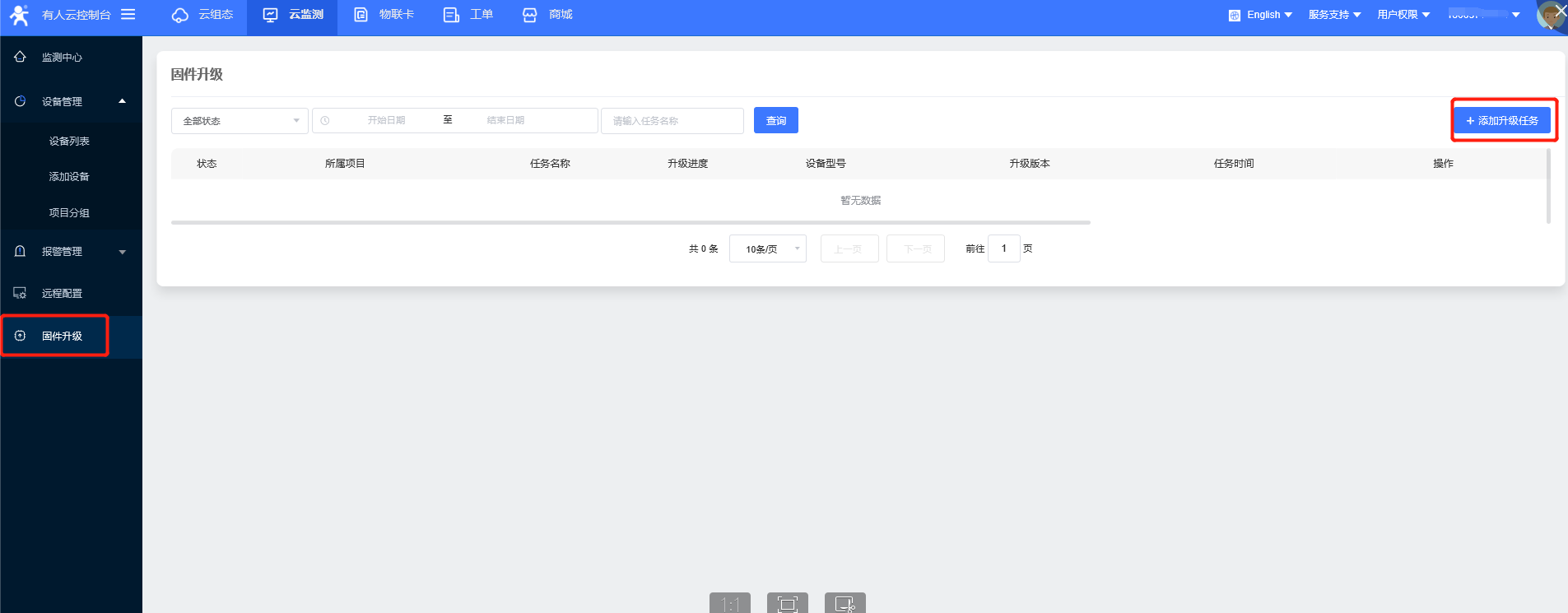 也可以在在“云監測”的“固件升級”下,點擊“添加升級任務”。