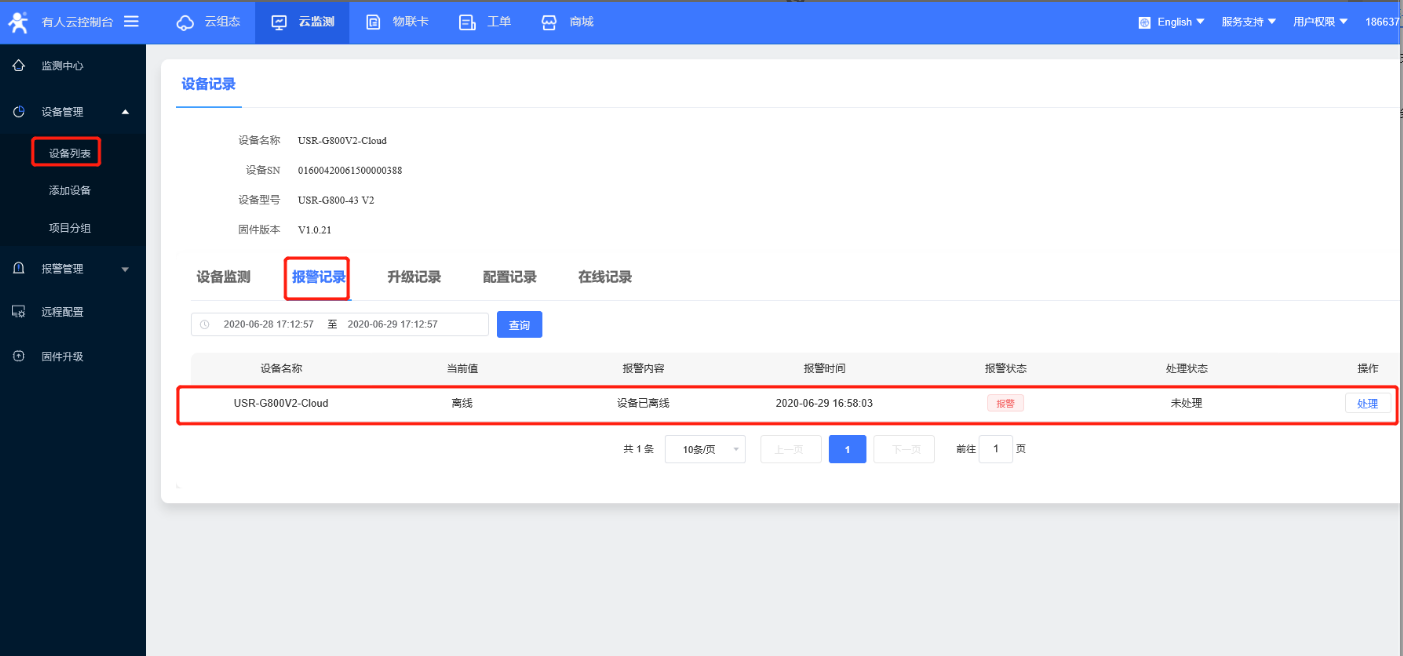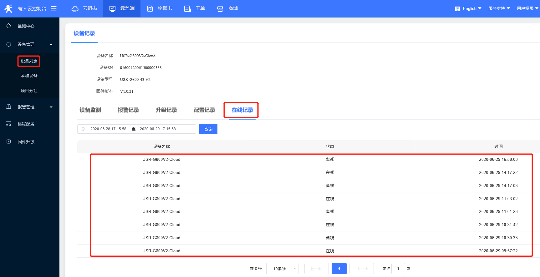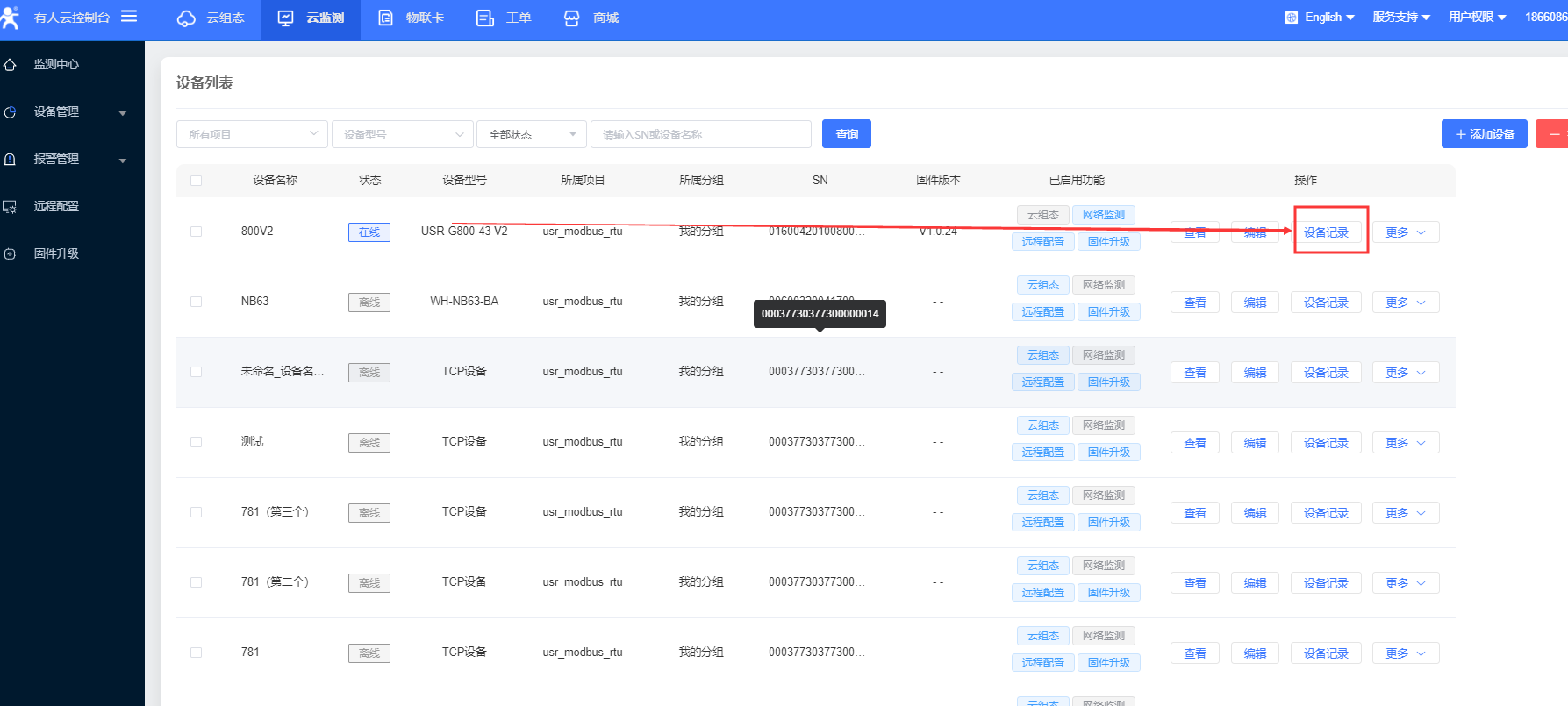 在“云監測”的“設備列表”下,找到相應設備,點擊“設備記錄”,頁面會顯示當前設備歷史信息