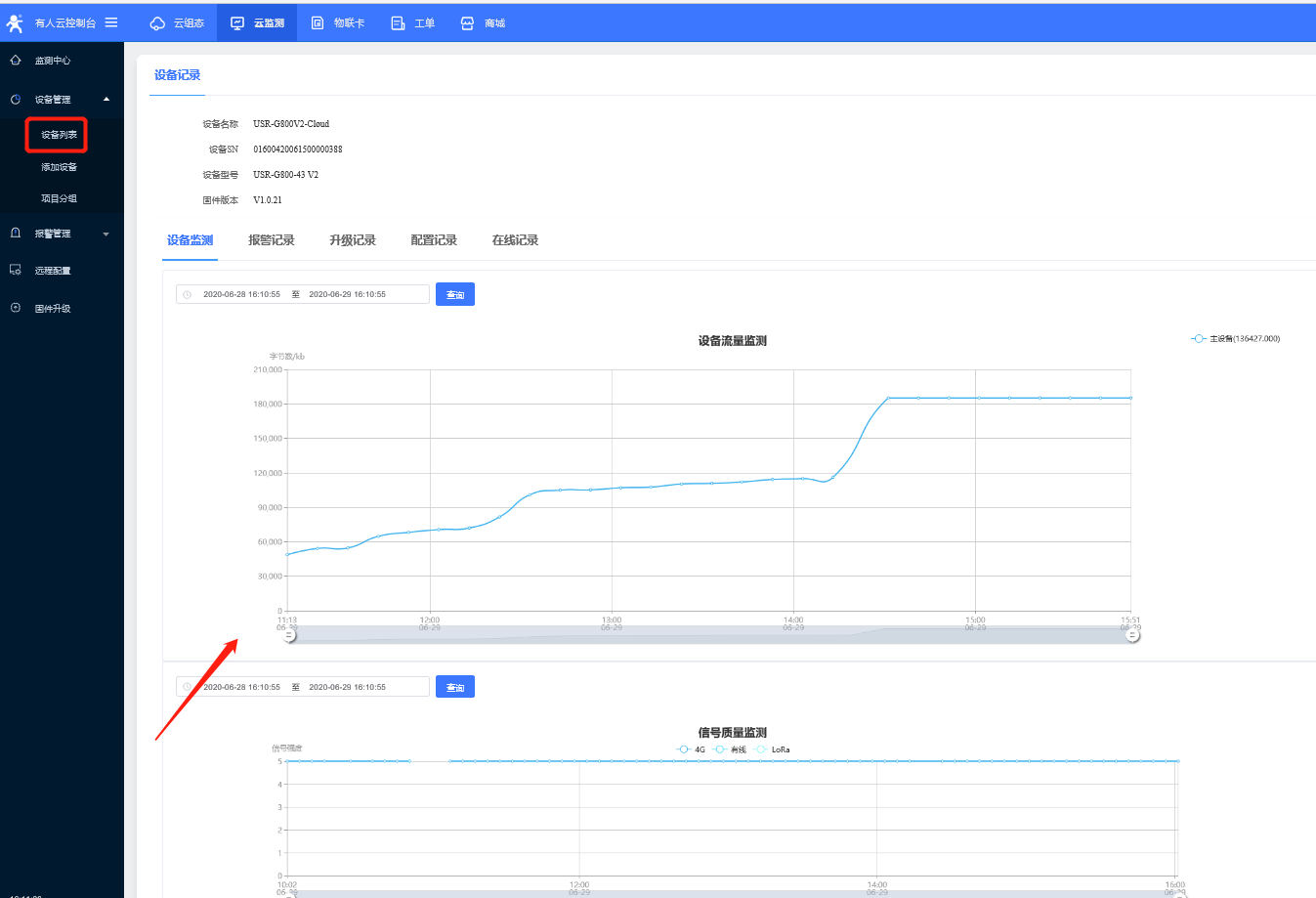 在“設備監測”一欄可以看到設備某個時間段的流量曲線、信號曲線