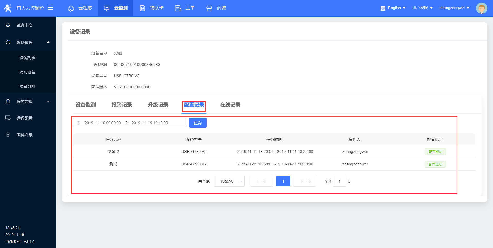 在“配置記錄”一欄可以看到設備在某個時間段的遠程配置任務的執行情況