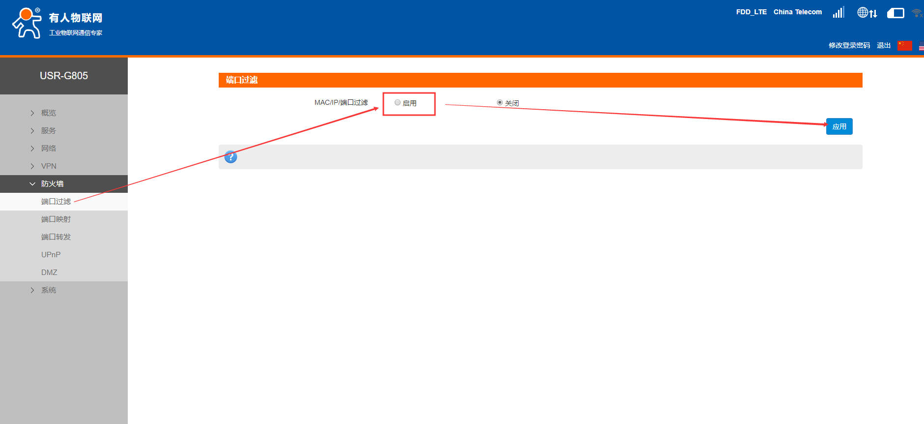 4. 在內置網頁--防火墻中端口過濾界面進行設置,啟用此功能之后點擊應用。