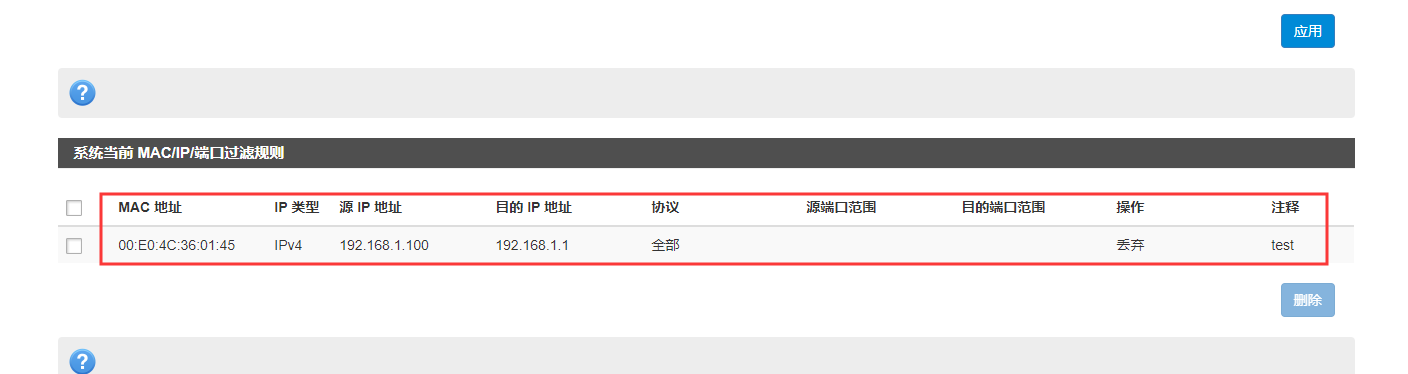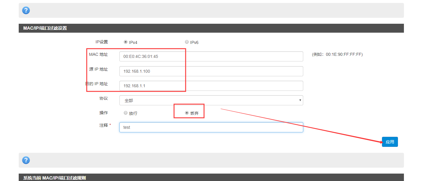 5.MAC和源IP地址設置連接805 的下級終端的MAC和IP,目標IP設置禁止訪問的IP,協議選擇全部,操作設置丟棄。