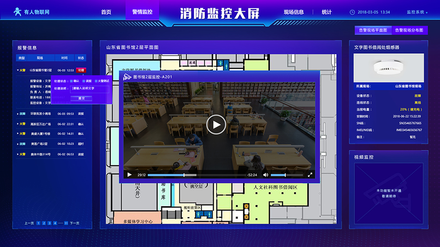 有人消防云平臺可實現遠程實時監控,對相關的火情信息、地點、時間、頻次等內容進行多維度、報表式呈現;支持對煙感探測器的安裝地點、運行狀態等進行查詢和展示。