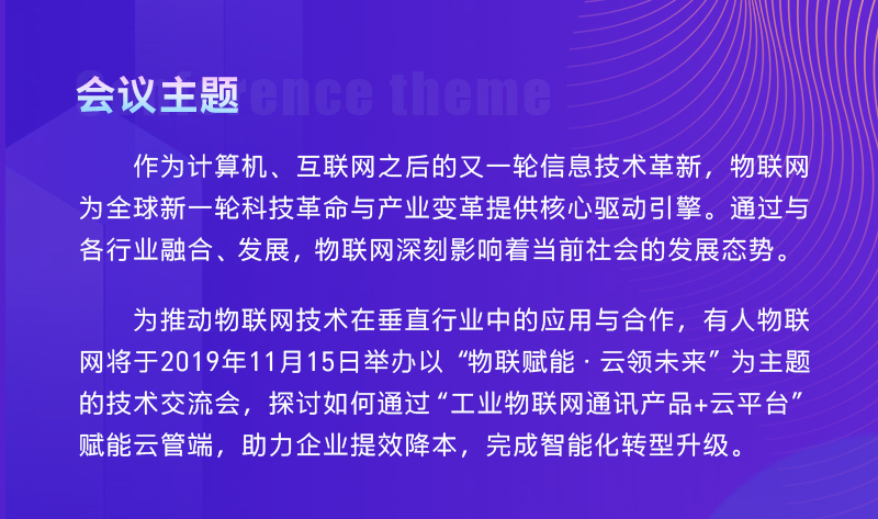 為推動物聯網技術在垂直行業中的應用與合作,有人物聯網將于2019年11月15日(本周五),在位于濟南東部新城區中心地帶的五星級豪華酒店——喜來登,舉辦以“物聯賦能·云領未來”為主題的技術交流會,探討如何通過“工業物聯網通訊產品+云平臺”賦能云管端,助力企業提效降本,完成智能化轉型升級。