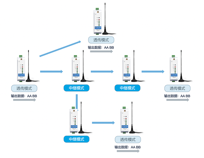 使用LoRa數據傳輸不再擔心現場環境障礙物多、傳數距離達不到需求的問題,中繼功能可運行多個中繼網絡,模塊自動轉發,增加無線傳輸距離,適用超遠距離或障礙物較多環境下通訊。