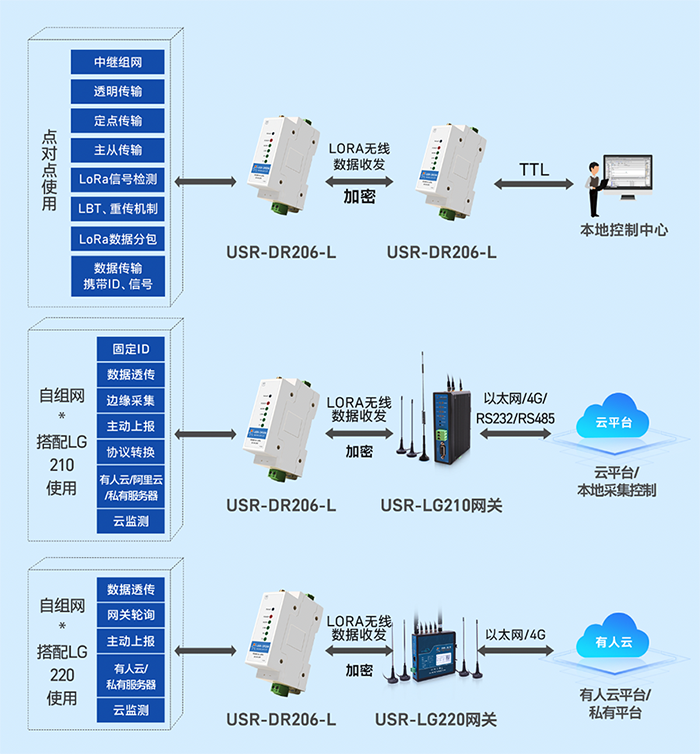 支持點對點+搭配LG210\LG220網關使用,一個產品能夠適應不同應用場景、功能豐富,用戶無須操作中間環節,即可實現端到端、端到云的數據傳輸。