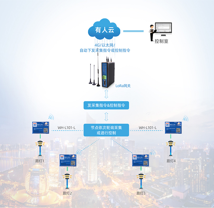LoRa網關與節點配合使用,LoRa節點與路燈設備通過串口連接,與網關組成LoRa局域網絡并分區管理,網關把采集到的數據上傳到云服務器,并借助4G或以太網等技術,遠程監控太陽能路燈的實時狀態、遠程控制開關燈、調光、查詢歷史數據及統計分析等。