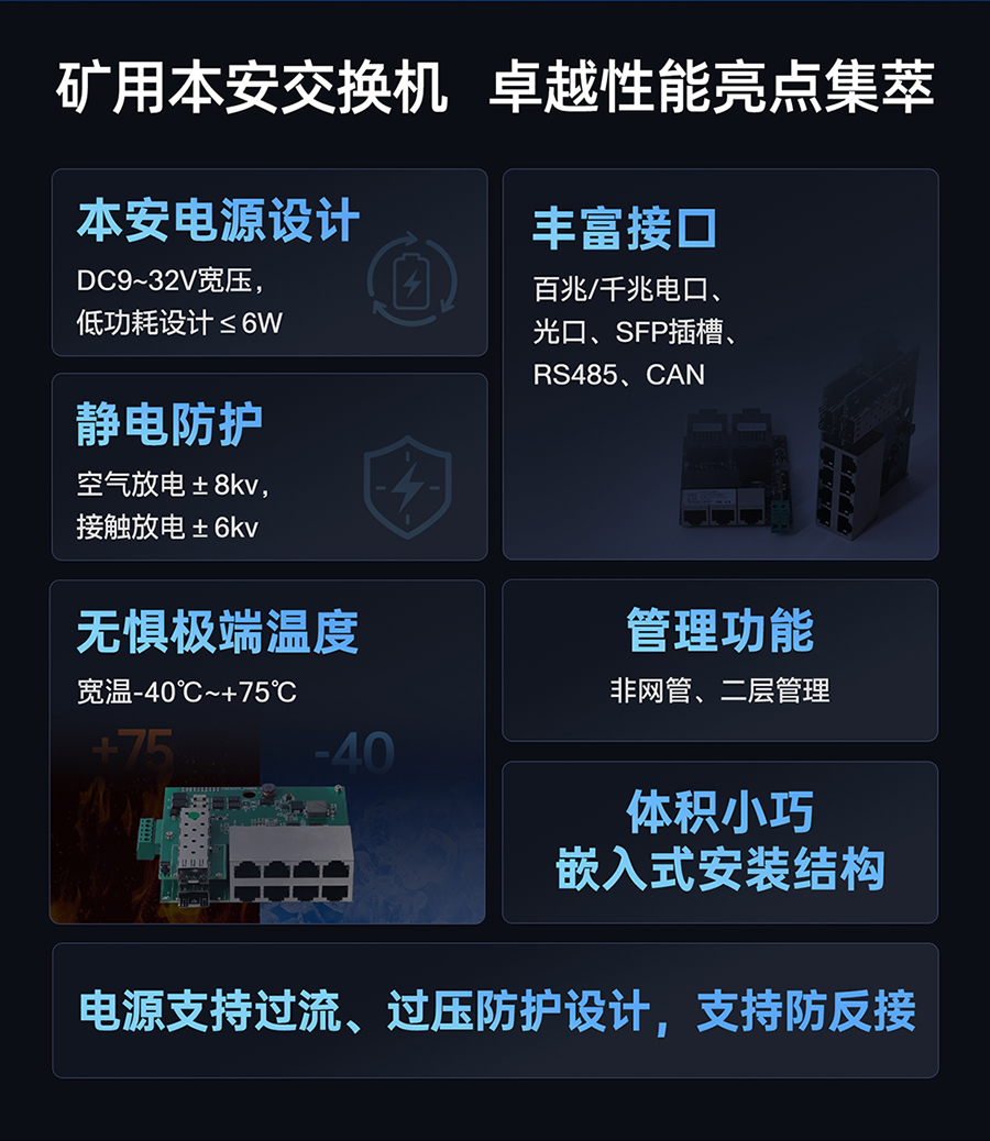硬核特點:本安電源設計;超低功耗,典型功耗≤6W;接口豐富;靜電防護;適應極端溫度; 非網管、二層網管可選;體積小巧,無外殼,嵌入式安裝。