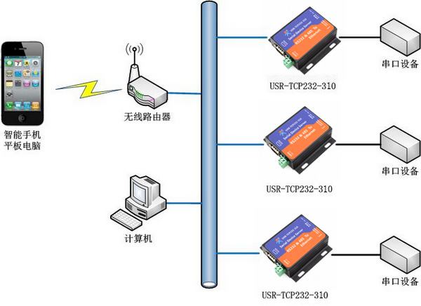 1、利用串口服務器實現計算機、移動終端遠程管理多個串口通訊設備
