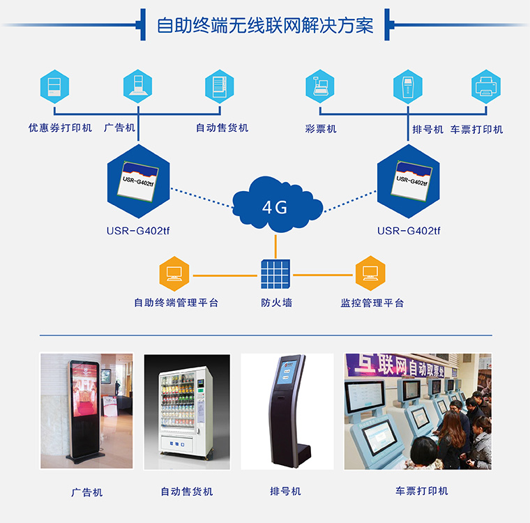 自助終端設備需要大數據量網絡傳輸,通過4G模塊高速聯網,將所有終端業務數據及設備運行狀態實時傳輸到業務中心,降低了業務中心運營成本,管理運營規?;?/p>