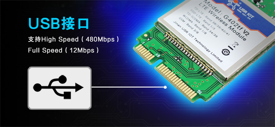 4G模塊G402tf有一路標準的USB2.0接口,支持High Speed(480Mbps)和Full Speed(12Mbps)兩種速度,可工作在HOST模式和DEVICE,USB接口和驅動配合,可以在PC上映射多個串口。