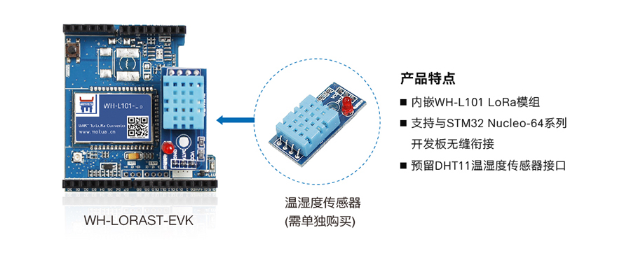 WH-LoRaST-EVK擴展板為STM32 Nucleo-64開發板的配件,板載WH-L101 LoRa模組和DHT11溫濕度傳感器,支持與STM32 Nucleo-64系列開發板無縫銜接,可幫助用戶快速構建與LoRa相關的應用。同時,用戶也能通過運行配套的Demo例程,實現使用STM32采集溫濕度數據并上報到有人透傳云的功能。用戶借助透傳云,可0編程實現多種形式的數據展示。