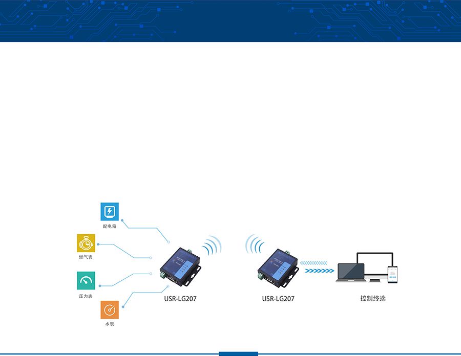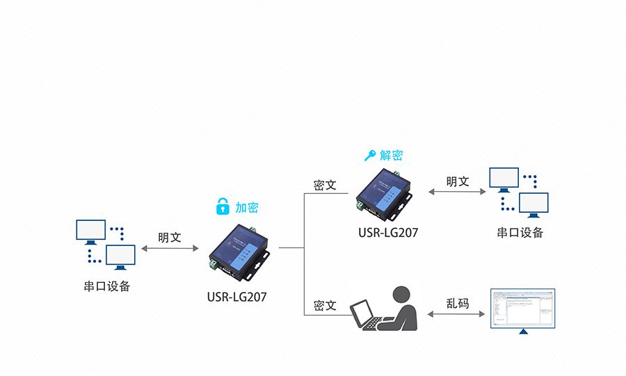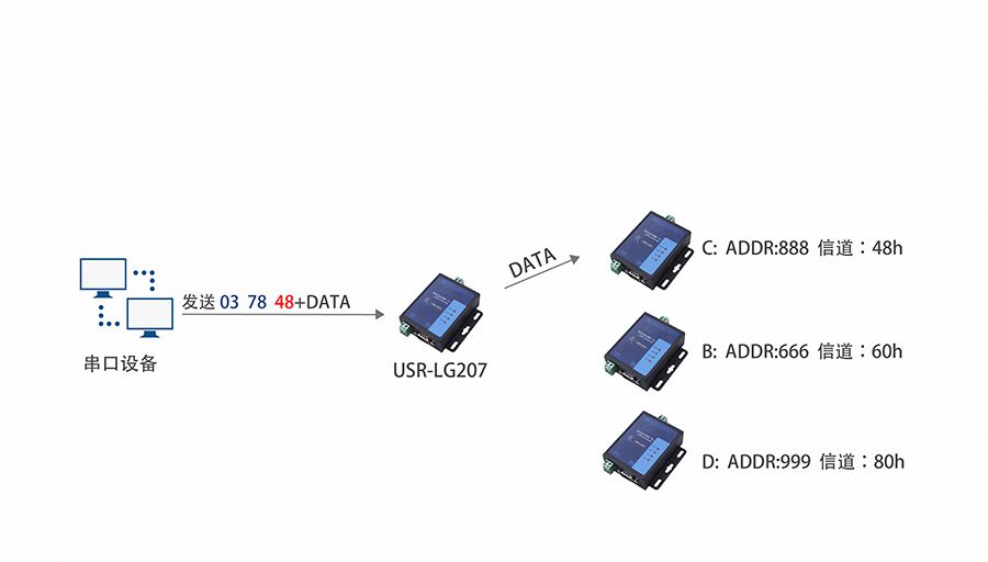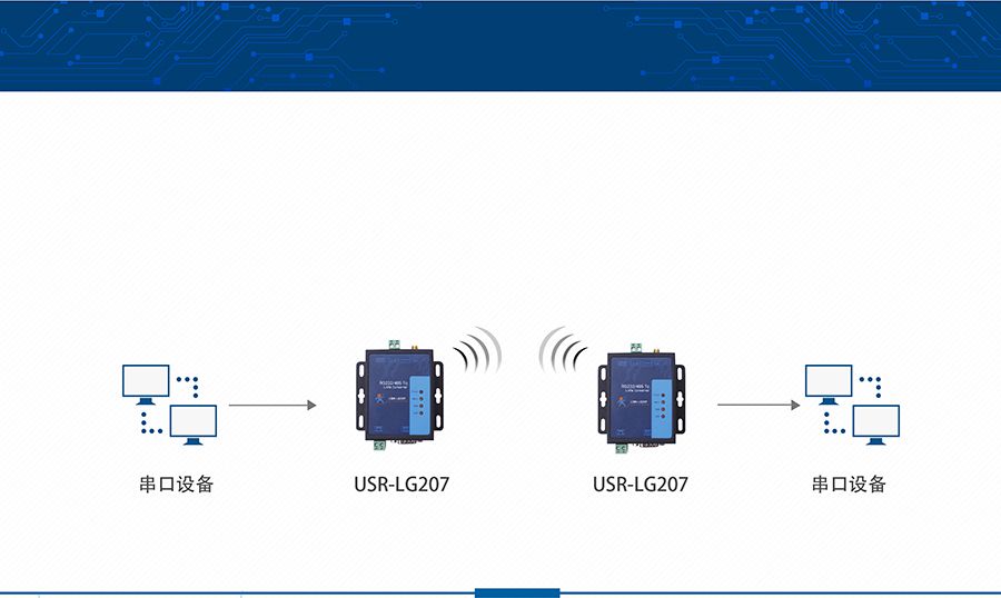 串口設備與串口設備之間通過兩個USR-LG207進行點對點傳輸,無需任何數據傳輸協議。