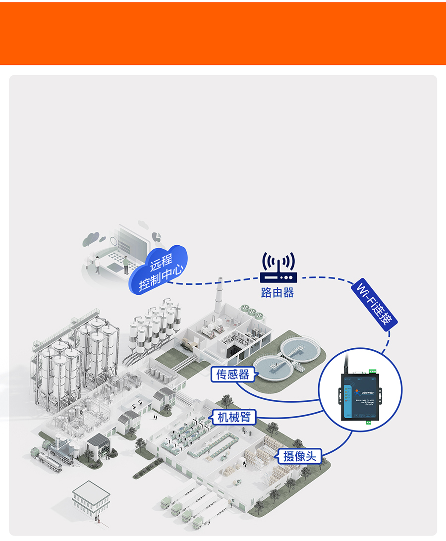 USR-w630與工廠里的串口設備相連,將設備運行數據實時上傳至本地監控