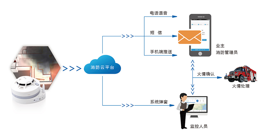 有人物聯網智慧消防云平臺通過電話自動語音、短信、手機端等多種形式,及時將火災告警信息推送至業主和消防管理員,并同時發送短信、輪播語音通知相關聯系人。火警通知將第一時間在管理監控平臺彈窗提醒,監控人員可第一時間通過平臺查找聯系方式通知業主確認火情。
