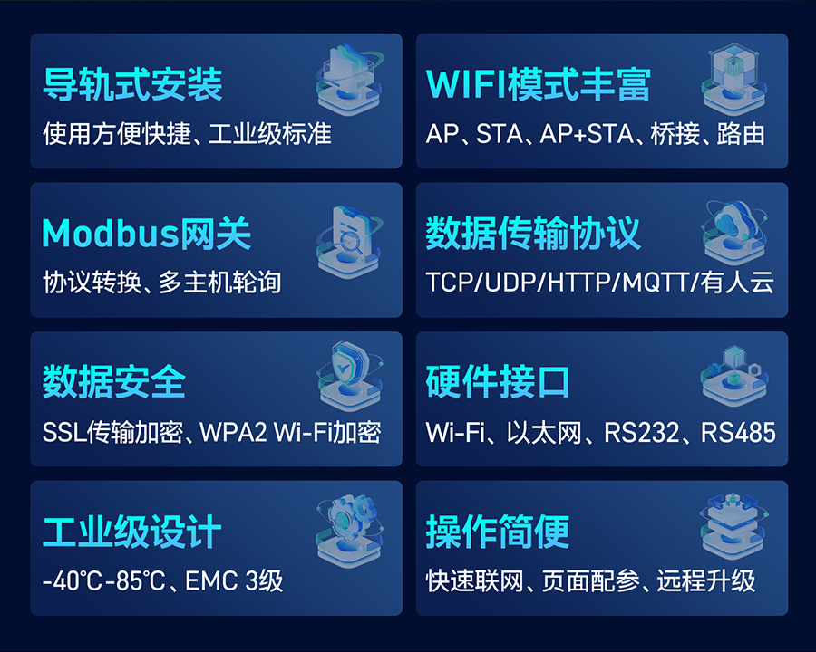 WEB頁(yè)面配置/遠(yuǎn)程升級(jí)、串口/網(wǎng)絡(luò)AT指令配置、手機(jī)APP配網(wǎng)。