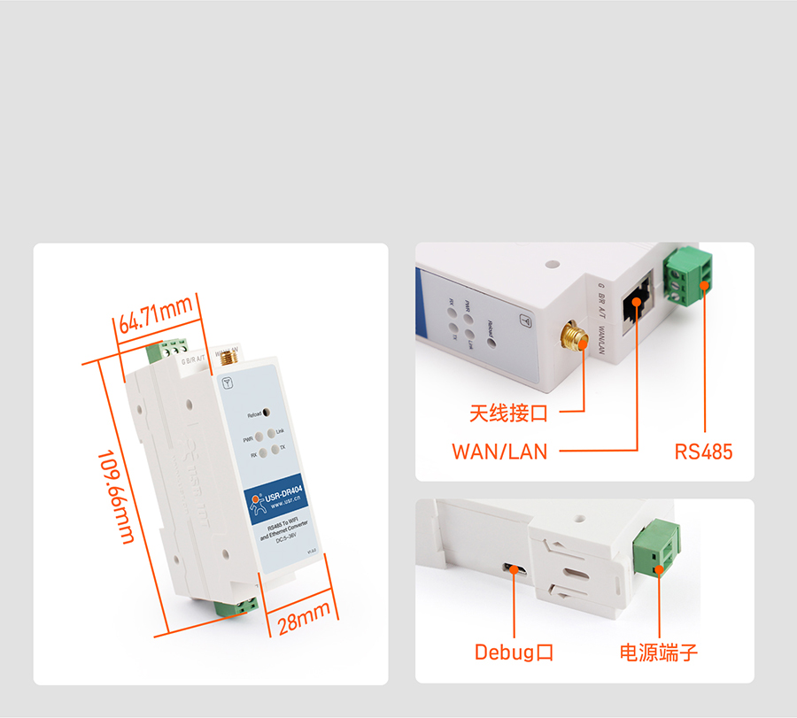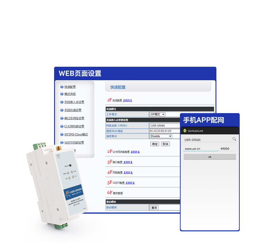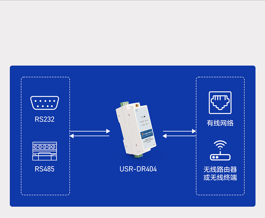 Wi-Fi接入設(shè)備的數(shù)據(jù)傳輸、PC設(shè)備對(duì)USR-DR404配置管理。