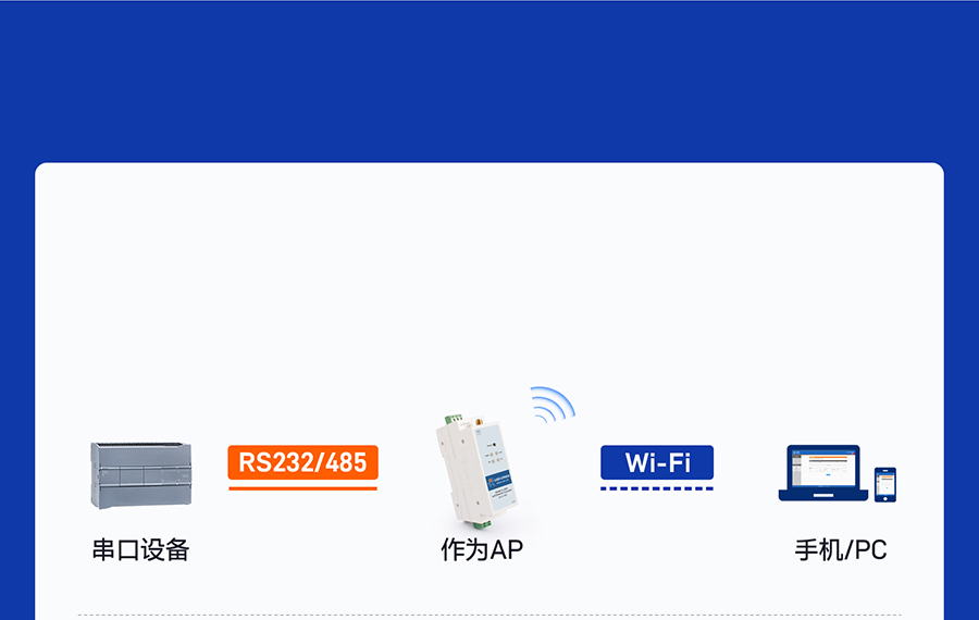 USR-DR404作為無線AP使用,提供Wi-Fi接入點(diǎn)功能,可實(shí)現(xiàn)串口終端與