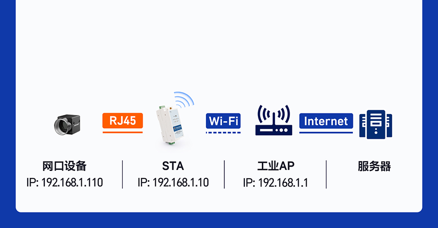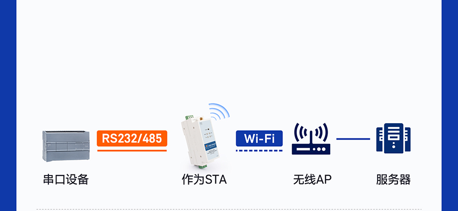 USR-DR404作為STA使用,通過Wi-Fi連接其他AP設(shè)備(如路由器),實(shí)現(xiàn)