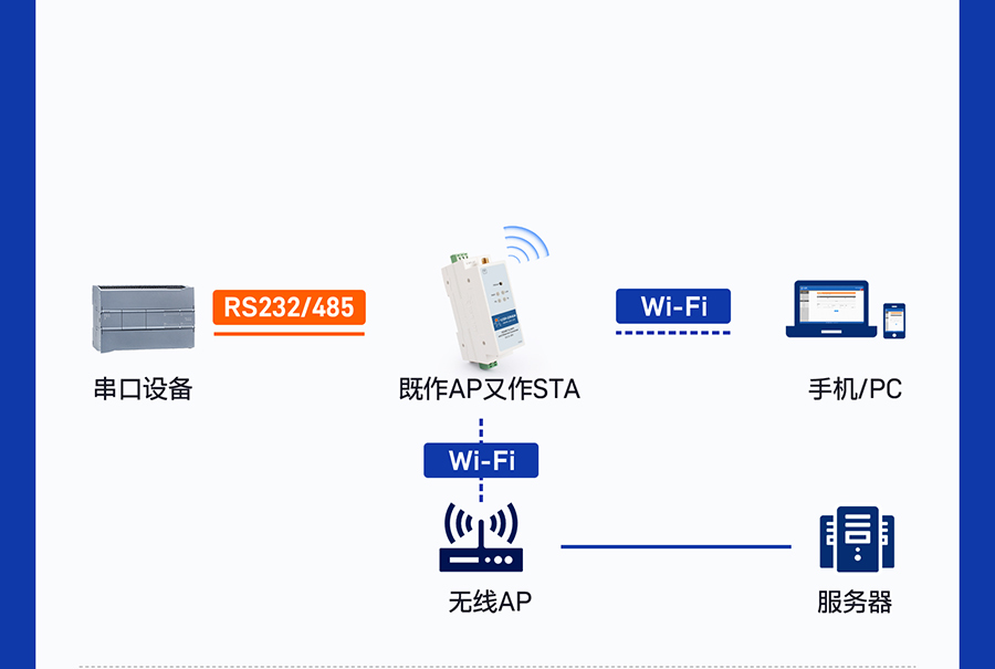 USR-DR404同時(shí)開啟無線AP和STA接口,可提供Wi-Fi接入功能和連接其他