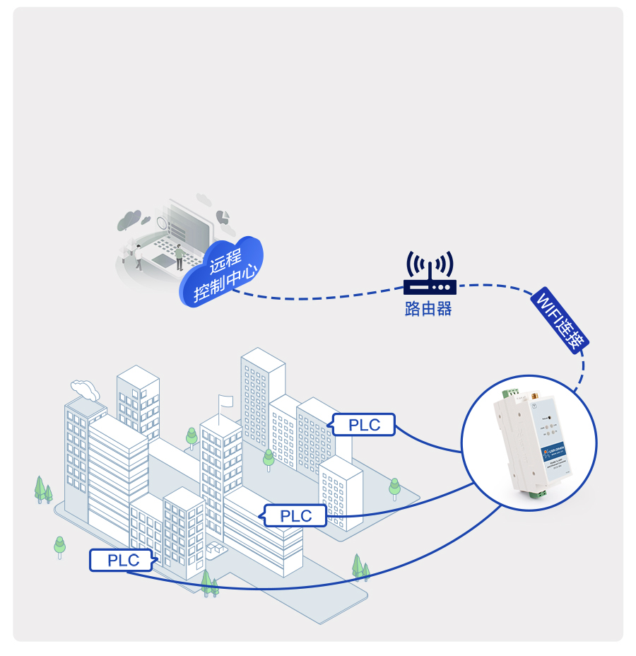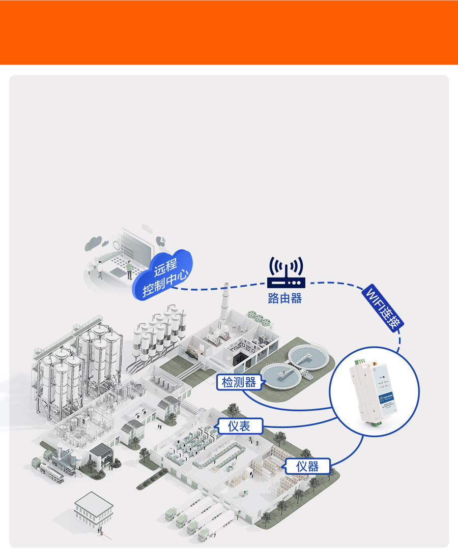 USR-DR404與工廠里的串口設(shè)備相連,將設(shè)備運(yùn)行數(shù)據(jù)實(shí)時(shí)上傳至本地監(jiān)控