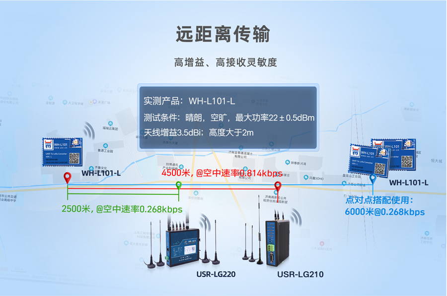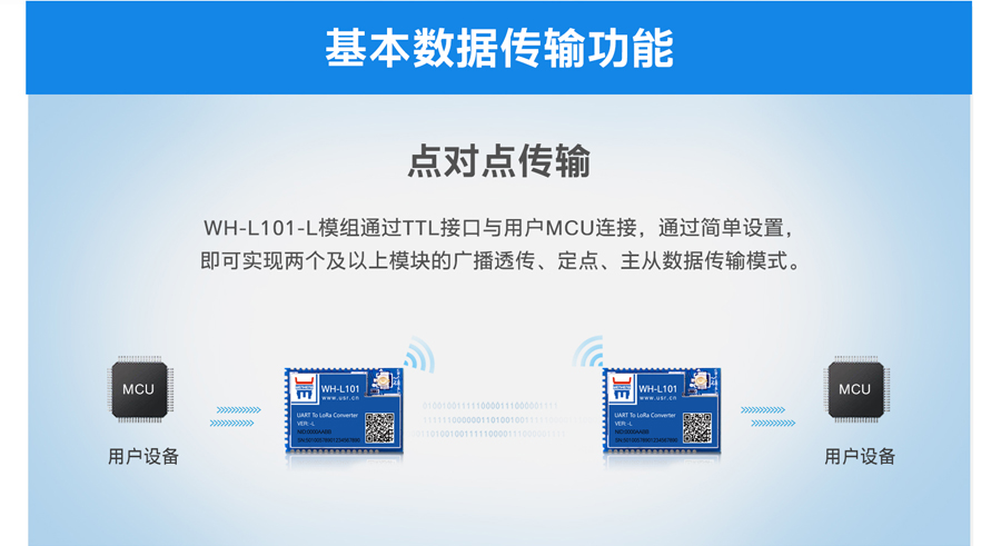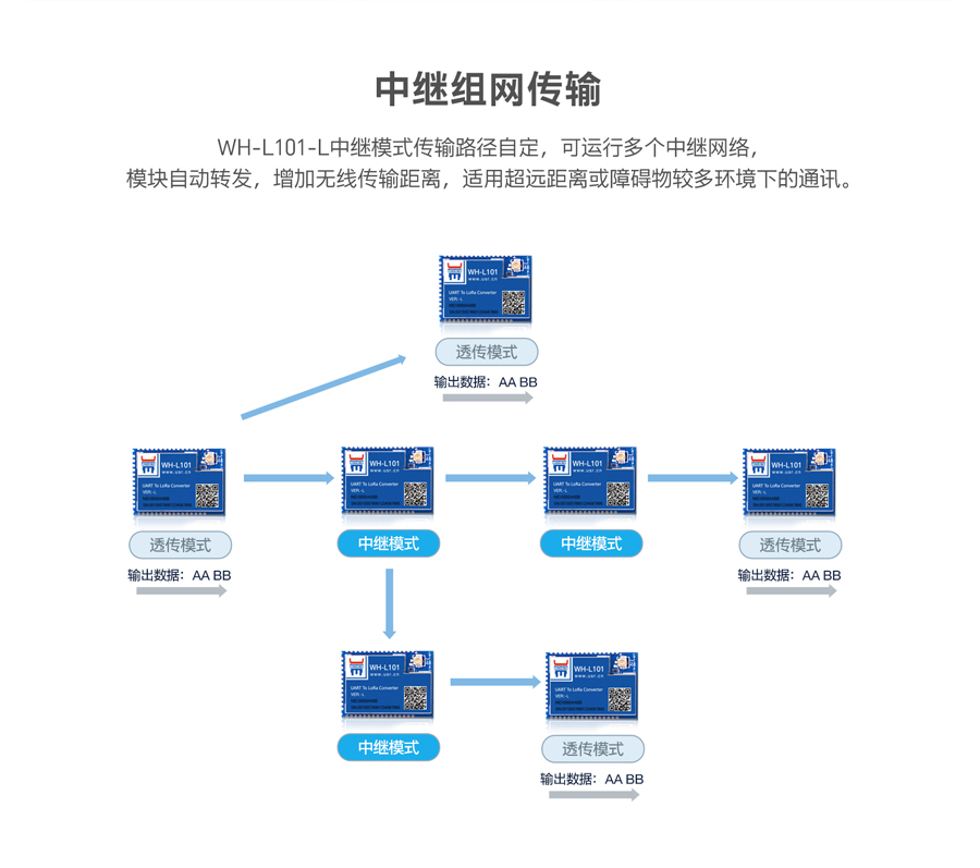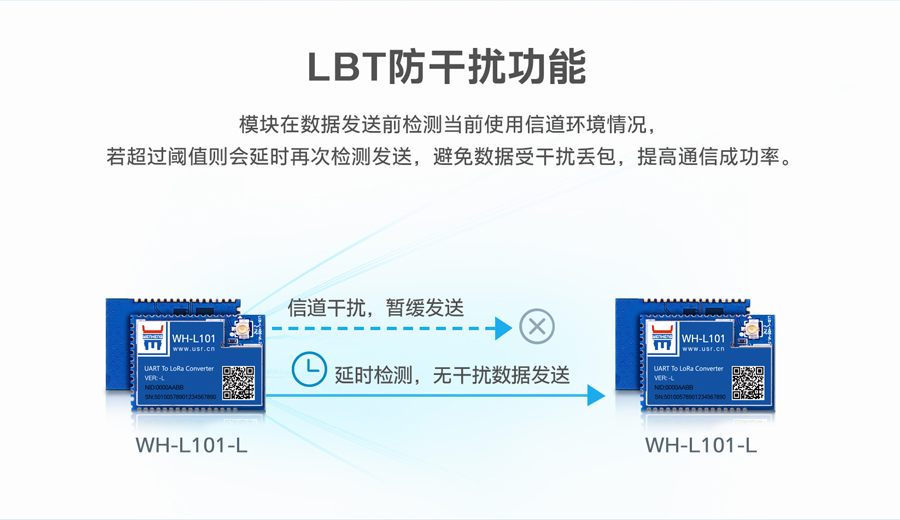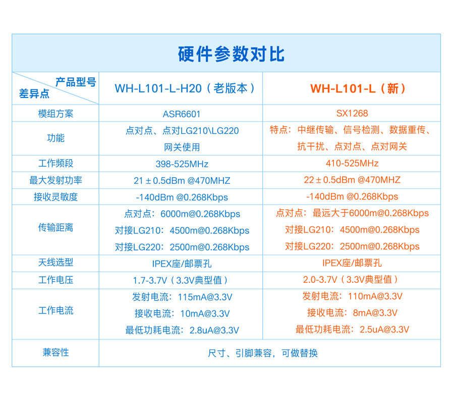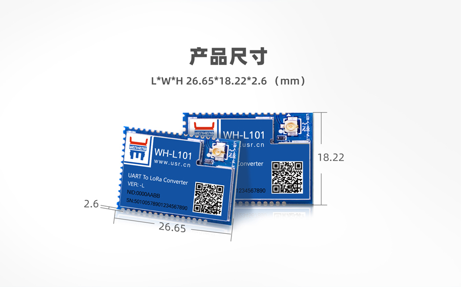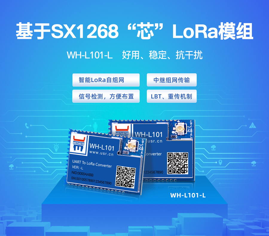 WH-L101-L是基于Sx1268芯片研發的升級版LoRa無線數傳模組,具有較高的抗干擾性和穩定性,增加中繼組網、信號檢測等功能,應用功能更多,其工作頻段410-525Mhz(默認頻率470Mhz)、工作范圍1.9-3.7V、點對點使用最低休眠電流僅2.5uA;能夠支持點對點、搭配LoRa網關使用,TTL電平輸出。