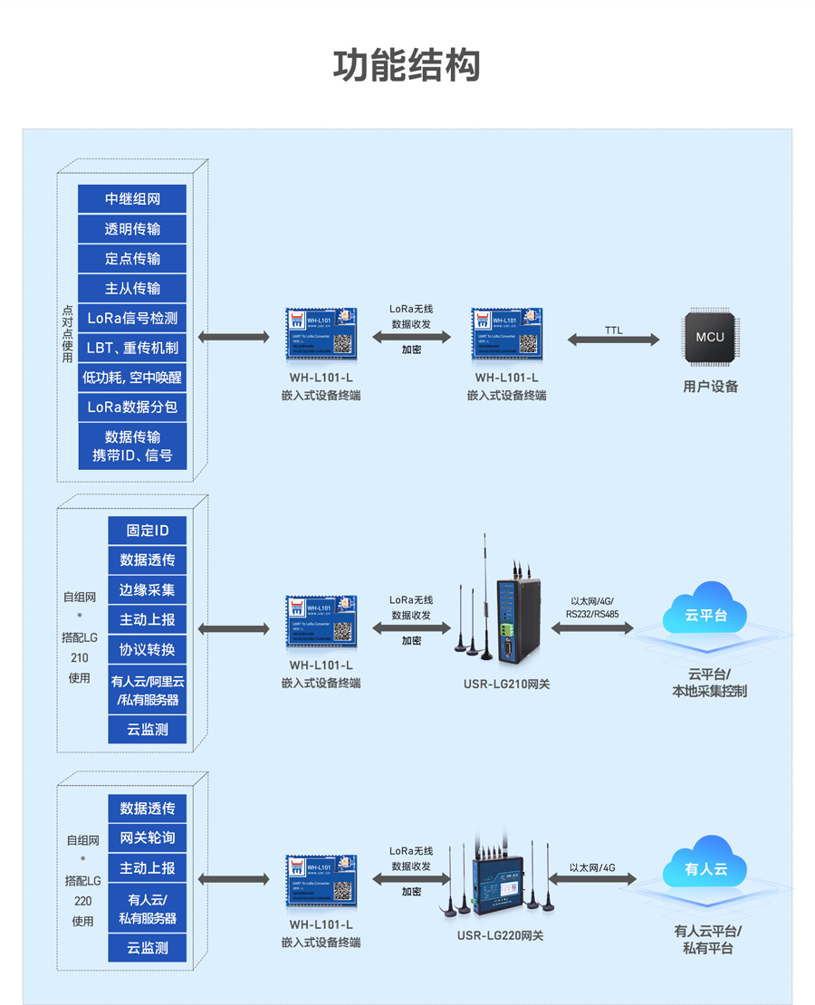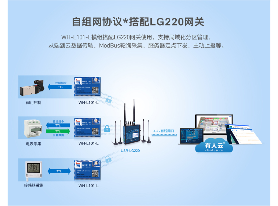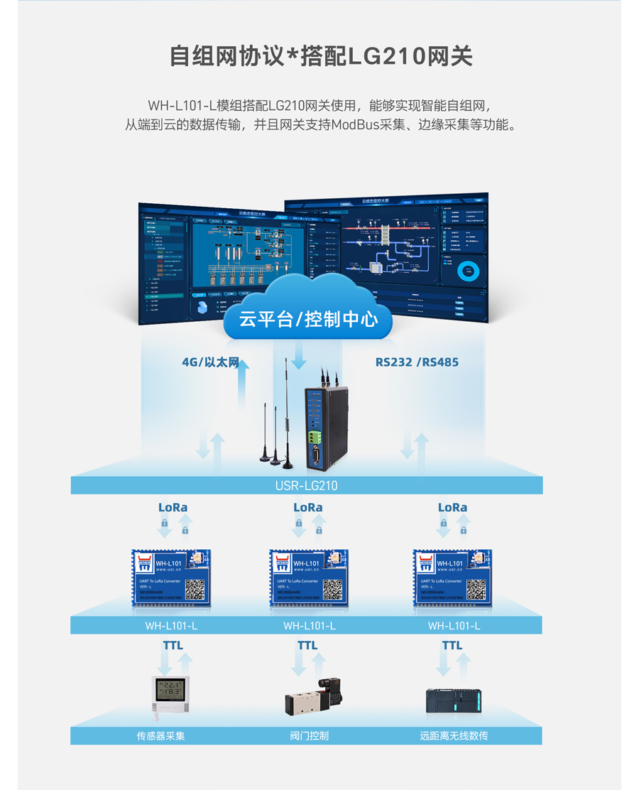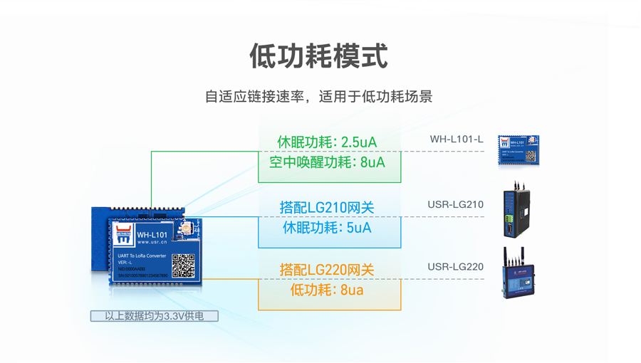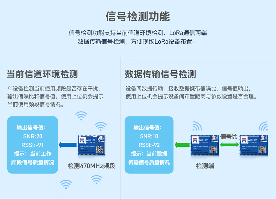 WH-L101-L是基于Sx1268芯片研發的升級版LoRa無線數傳模組,具有較高的抗干擾性和穩定性,增加中繼組網、信號檢測等功能,應用功能更多,其工作頻段410-525Mhz(默認頻率470Mhz)、工作范圍1.9-3.7V、點對點使用最低休眠電流僅2.5uA;能夠支持點對點、搭配LoRa網關使用,TTL電平輸出。