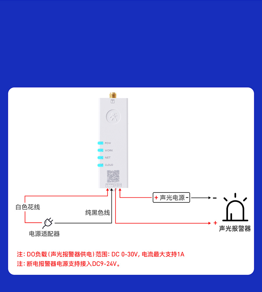 報警器電源接線:適配器白色花線接“DC+”,純黑色線接“DC-”; 聲光報警器接線:聲光電源正極接“COM”,聲光電源負極接到聲光 報警器的供電負極,斷電報警器的“DO”接到聲光報警器的供電正極