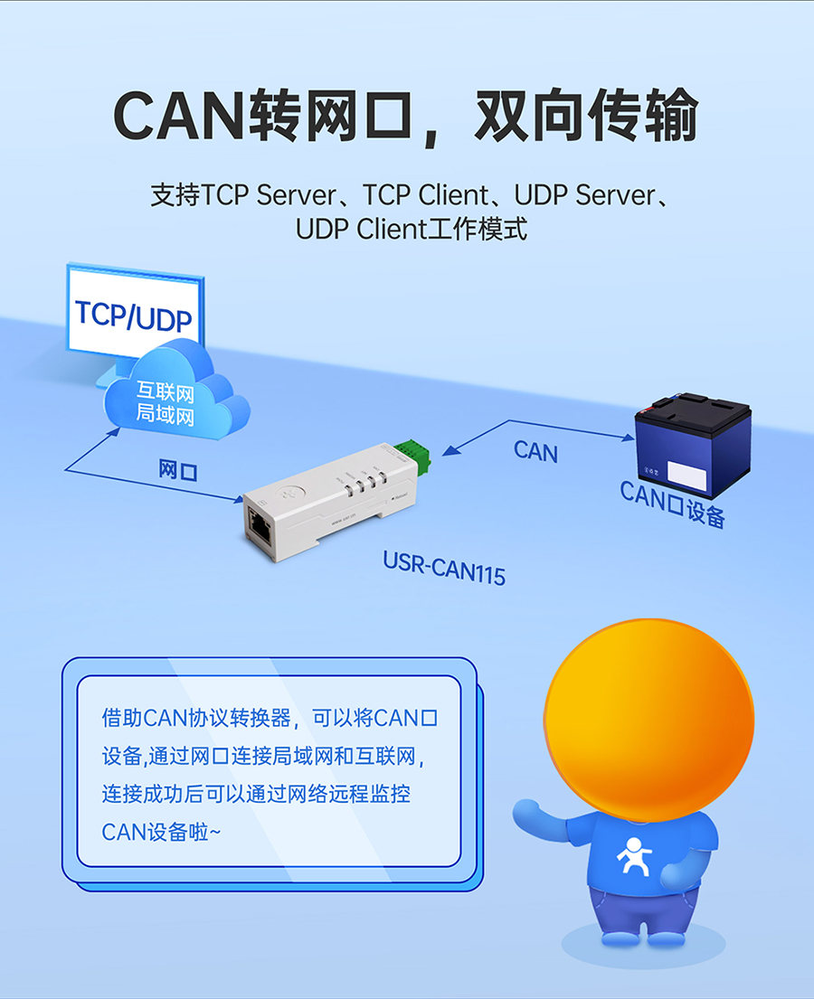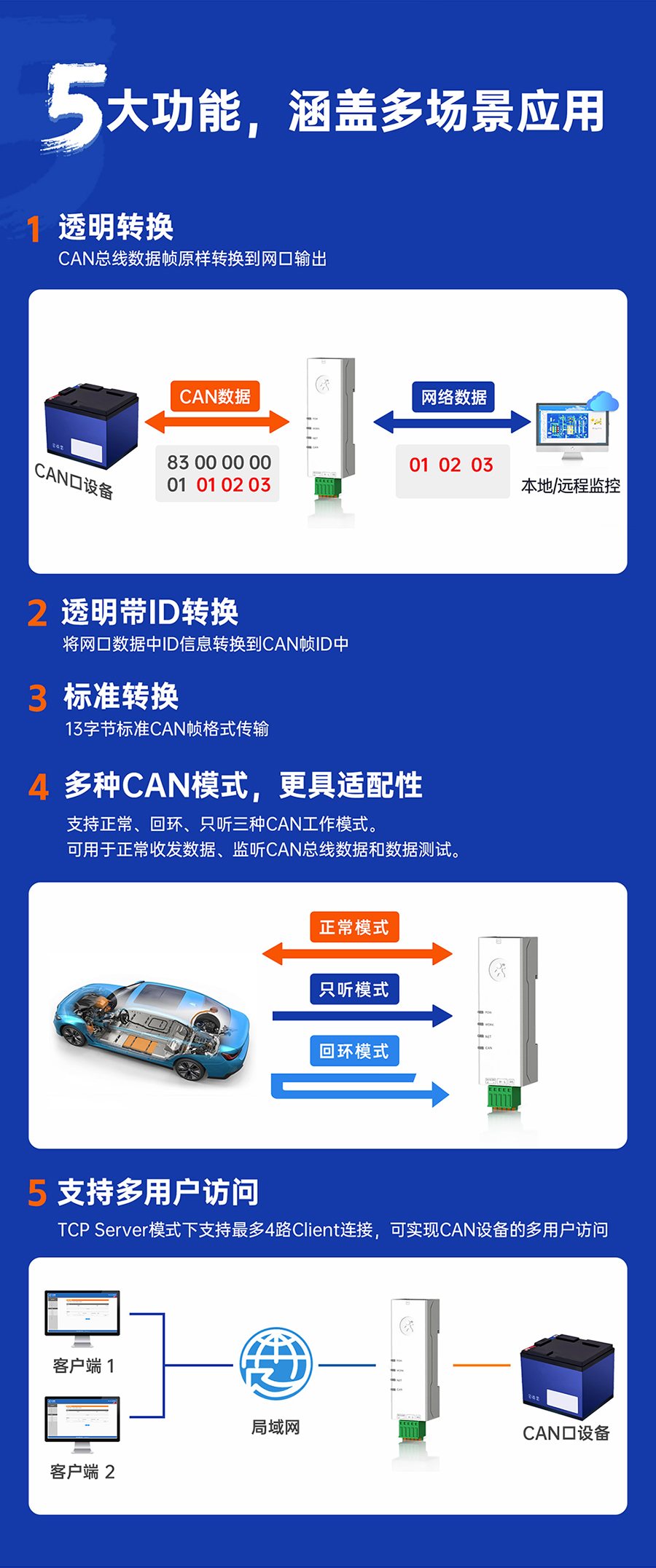 支持雙向轉換、僅網口轉CAN、僅CAN轉網口