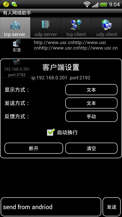 安卓 android 網絡調試助手 (TCPIP UDP 測試),這是一個手機或者平板上調試TCPIP通訊的工具,配置WIFI轉串口模塊,就可以實現手機調試串口通訊了。本軟件支持TCP Server, TCP Client, UDP Server, UDP client 模式,支持中英文自動識別切換。