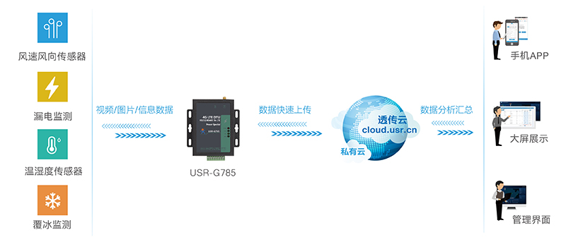 1、輸變電設(shè)備通過多種傳感器將探測(cè)到的溫濕度、風(fēng)速、風(fēng)向、漏電、覆冰等數(shù)據(jù)信息,通過4G DTU USR-G785快速上傳至輸電線路在線監(jiān)測(cè)中心;