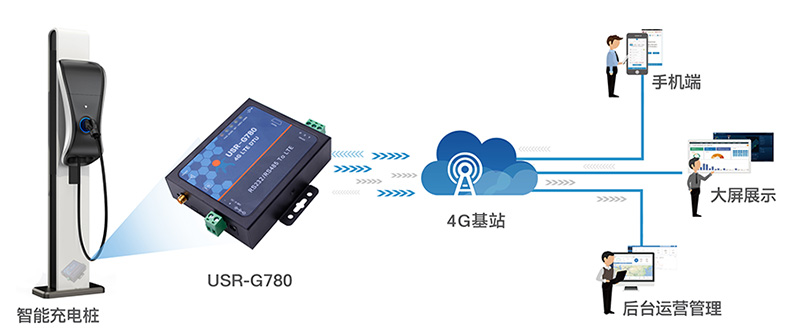 1、將4G DTU USR-G780嵌入充電樁,連接控制系統(tǒng),為設備提供4G聯網功能