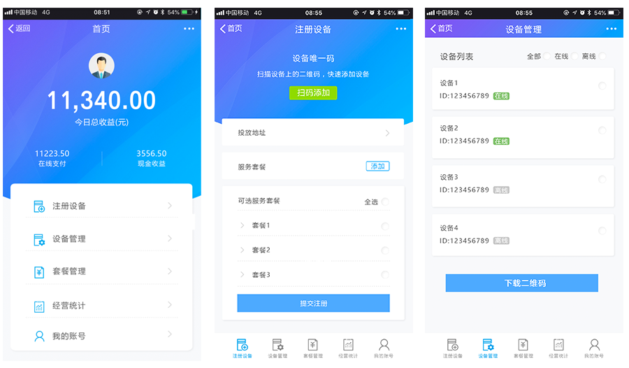 有人掃碼支付管理平臺,操作簡單,使用方便,賬戶注冊、子賬戶添加、支付成功/失敗、收益詳情、設備地址、運行狀況等運營商關(guān)注的數(shù)據(jù)信息,直觀展示,一目了然。