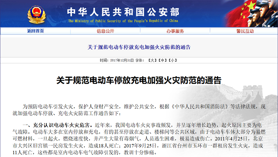 此后,全國多個地方政府紛紛出臺相關政策。濟南市公安局下發了《關于進一步加強電動車消防安全管理的通知》;北京市住房和城鄉建設委員會轉發了《規范電動車安全使用管理工作方案》;江蘇省消防安全委員會下發了《電動車停放、充電場所和民用建筑燃氣使用場所消防安全須知》。