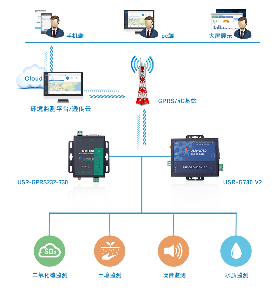有人DTU&環境監測平臺/透傳云聯網傳輸應用案例拓撲圖——