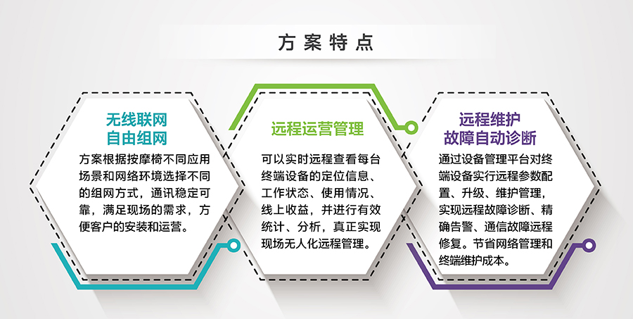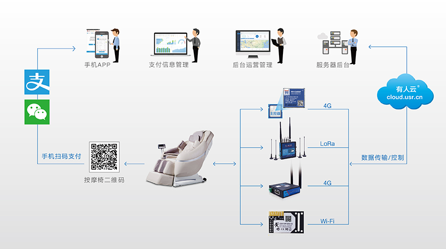 為方便運營商通過平臺管理和監控所有按摩椅,為滿足不用應用場景,有人物聯網提出了基于無線通信技術的共享按摩解決方案,主要實現共享按摩椅的資產定位、機器運行狀態數據的實時監控、信息靈活組網傳輸、遠程控制等功能。