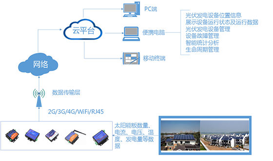 有人發電機組物聯網遠程監控系統由DTU、云平臺、應用系統三部分組成。通過DTU將采集到的光伏發電設備各種數據上傳到云平臺進行存儲、整理、分析,然后在通過應用系統將設備運行狀態、地理位置、告警提示等信息展示給用戶,實現光伏發電設備的遠程智能化管理。