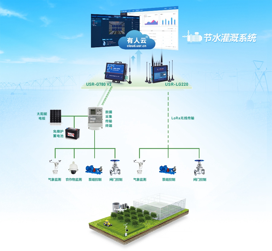 農(nóng)業(yè)節(jié)水灌溉系統(tǒng)主要由土壤水分傳感器、氣象監(jiān)測站、閥泵控制、視頻、采集控制終端、無線通訊模塊、光伏電源系統(tǒng)以及有人云農(nóng)業(yè)管理監(jiān)控平臺等組成。系統(tǒng)整合區(qū)域內(nèi)水文水情、氣象作物、工情等信息,實現(xiàn)了信息的采集、統(tǒng)計、分析、控制、調(diào)度等功能。為灌區(qū)管理部門提供科學(xué)決策依據(jù),提升灌區(qū)的管理效能,實現(xiàn)農(nóng)業(yè)灌溉自動化。